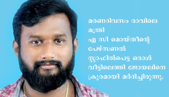 സംഭവദിവസം രാവിലെ മന്ത്രി എ സി മൊയ്തീന്റെ പേഴ്സണല് സ്റ്റാഫില്പെട്ട ഒരാള് വീട്ടിലെത്തി ജോയലിനെ ക്രൂരമായി മര്ദിച്ചിരുന്നു. ഇതിനുശേഷമാണ് വാഹനങ്ങള് കൂട്ടിയിടിച്ചത്. ചികിത്സകള് തുടരുന്നതിനിടെ മേയ് 22ന് ജോയല് മരിച്ചു. ബന്ധുക്കളുടെ പരാതിയില് കോട്ടയം മെഡിക്കല് കോളജില് മൃതദേഹം പോസ്റ്റുമോര്ട്ടം നടത്തി.
