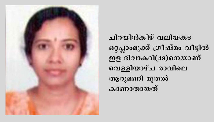 തിരുവനന്തപുരം: സെക്രട്ടറിയേറ്റിലെ അണ്ടര്‍ സെക്രട്ടറി ആയ യുവതിയെ കാണാതായി. സ്‌കൂട്ടര്‍ ആറ്റിന്‍കരയില്‍ നിന്നു കണ്ടുകിട്ടി. തിരച്ചില്‍ നടക്കുന്നു. ചിറയിന്‍കീഴ് വലിയകട ഒറ്റപ്ലാംമുക്ക് ഗ്രീഷ്മം വീട്ടില്‍ ഇള ദിവാകറി(49)നെയാണ് വെള്ളിയാഴ്ച രാവിലെ ആറുമണി മുതല്‍ കാണാതായത്. അടുത്തിടെയാണ് ഇളയ്ക്ക് അണ്ടര്‍ സെക്രട്ടറിയായി സ്ഥാനക്കയറ്റം ലഭിച്ചത്.