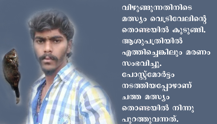 വിഴുങ്ങുന്നതിനിടെ മത്സ്യം വെട്രിവേലിന്റെ തൊണ്ടയില് കുടുങ്ങി. ഉടന് സുഹൃത്തുക്കള് ഹൊസൂരിലെ ആശുപത്രിയില് എത്തിച്ചെങ്കിലും മരണം സംഭവിച്ചു. പോസ്റ്റ്മോര്ട്ടം നടത്തിയപ്പോഴാണ് ചത്ത മത്സ്യം തൊണ്ടയില്നിന്നു പുറത്തുവന്നത്. അതേസമയം സംഭവവുമായി ബന്ധപ്പെട്ട് ഒരു വീഡിയോയും കണ്ടെത്തിയിട്ടില്ലെന്നും വെട്രിവേലിന്റെ സുഹൃത്തുക്കളെ കേന്ദ്രീകരിച്ച് അന്വേഷണം നടക്കുന്നുണ്ടെന്നും പൊലീസ് അറിയിച്ചു.