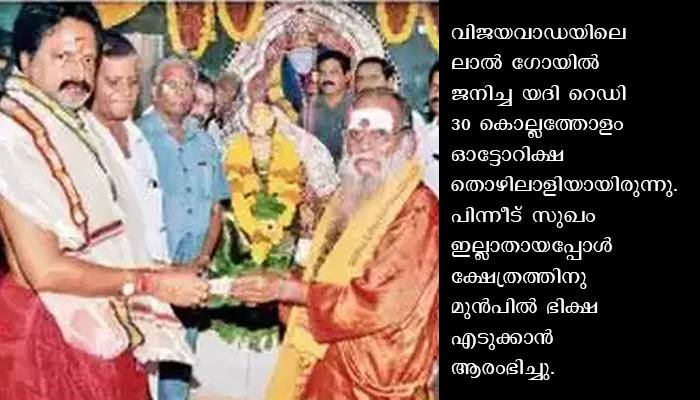 വിജയവാഡയിലെ ലാൽ ഗോണ്ടയിൽ ജനിച്ച യദി റെഡി 30 കൊല്ലത്തോളം ഓട്ടോറിക്ഷ തൊഴിലാളിയായിരുന്നു. പിന്നീട് സുഖം ഇല്ലാതായപ്പോൾ ക്ഷേത്രത്തിനു മുൻപിൽ ഭിക്ഷ എടുക്കാൻ ആരംഭിച്ചു. രോഗം മാറിയപ്പോൾ ഒരു ലക്ഷം രൂപ ക്ഷേത്രത്തിലേക്ക് സംഭാവന ചെയ്തു. തന്നെ പോലെ ഒരാൾ ഇത്രയും വലിയ തുക സംഭാവന ചെയ്യുന്നത് എല്ലാവരിലും അത്ഭുതം ഉണ്ടാക്കാറുണ്ടെന്ന് യദി റെഡി.