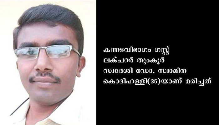 ന്യൂഡല്ഹി: കാസര്കോട് കേന്ദ്ര സര്വകലാശാലയിലെ അധ്യാപകന് ബൈക്കപകടത്തില് മരിച്ചു. കന്നടവിഭാഗം ഗസ്റ്റ് ലക്ചറര് തുംകൂര് സ്വദേശി ഡോ. സ്വാമിന കൊദിഹള്ളി(35)യാണ് മരിച്ചത്. ഞായറാഴ്ച ഉച്ചകഴിഞ്ഞ് 2.30ഓടെ തുംകൂറിന് സമീപം രംഗപുര ചെക്ക്പോസ്റ്റിലാണ് അപകടമുണ്ടായത്. ഭാര്യാമാതാവായ രത്നമ്മയ്ക്കൊപ്പം ഒരു വിവാഹത്തില് പങ്കെടുത്തശേഷം ബൈക്കില് മടങ്ങിവരുമ്പോഴാണ് അപകടം.