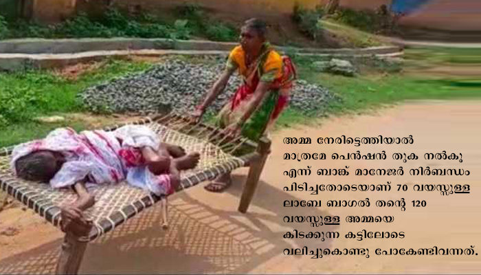 അമ്മ നേരിട്ടെത്തിയാല്‍ മാത്രമേ പെന്‍ഷന്‍ തുക നല്‍കൂ എന്ന് ബാങ്ക് മാനേജര്‍ നിര്‍ബന്ധം പിടിച്ചതോടെയാണ് 70 വയസ്സുള്ള ലാബേ ബാഗല്‍ തന്റെ 120 വയസ്സുള്ള അമ്മയെ കിടക്കുന്ന കട്ടിലോടെ വലിച്ചുകൊണ്ടു പോകേണ്ടിവന്നത്. ബരാഗാന്‍ ഗ്രാമത്തില്‍ ബുധനാഴ്ചയാണ് സംഭവമുണ്ടായത്.