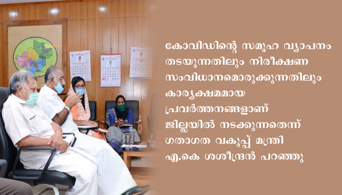 വയനാട് : കോവിഡിന്റെ സമൂഹ വ്യാപനം തടയുന്നതിലും നിരീക്ഷണ സംവിധാനമൊരുക്കുന്നതിലും കാര്യക്ഷമമായ പ്രവര്ത്തനങ്ങളാണ് ജില്ലയില് നടക്കുന്നതെന്ന് ഗതാഗത വകുപ്പ് മന്ത്രി എ.കെ ശശീന്ദ്രന് പറഞ്ഞു. ഭൂരിഭാഗം മേഖലകളിലും നിയന്ത്രണങ്ങള് ഒഴിവാക്കിയ സാഹചര്യത്തില് ആരും ഇളവുകള് ദുരുപയോഗം ചെയ്യരുത്. ജാഗ്രത തുടരണമെന്നും അദ്ദേഹം പറഞ്ഞു. ജില്ലയില് കോവിഡ് പ്രതിരോധ പ്രവര്ത്തനങ്ങള് വിലയിരുത്തുന്നതിന്റെ ഭാഗമായി കളക്ട്രേറ്റില് ചേര്ന്ന യോഗത്തില് അധ്യക്ഷത വഹിക്കുകയായിരുന്നു അദ്ദേഹം.