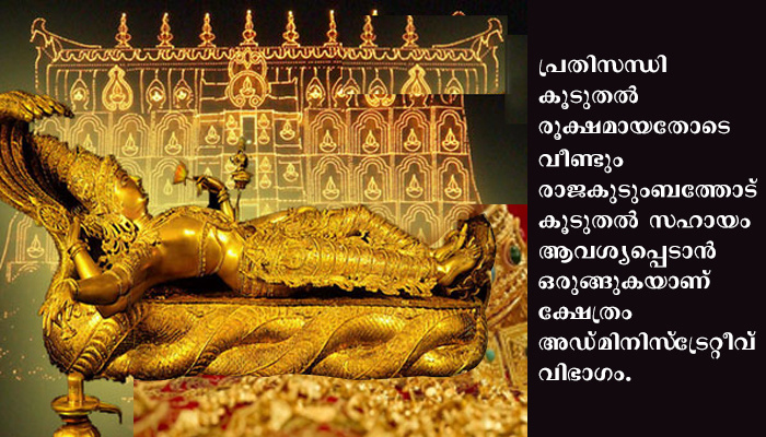തുടര്ന്ന് ക്ഷേത്രം രാജകുടുംബത്തിന്റെ സഹായം തേടി. പ്രതിസന്ധി കണക്കിലെടുത്ത് 25 ലക്ഷം രൂപ തിരുവിതാംകൂര് രാജകുടുംബം വകയായി നല്കി.പ്രതിമാസം ഏകദേശം 1.5 കോടി രൂപയായിരുന്നു തിരുവനന്തപുരത്തെ ശ്രീപത്മനാഭ സ്വാമി ക്ഷേത്രത്തിലെ വരുമാനം. 1.25 കോടി രൂപ ജീവനക്കാരുടെ ശമ്പളം, പെന്ഷന് എന്നിവയ്ക്കു വേണ്ടിയും 45 ലക്ഷം രൂപ പൂജകള്ക്കും മറ്റുമായാണ് ചെലവഴിച്ചിരുന്നത്. .