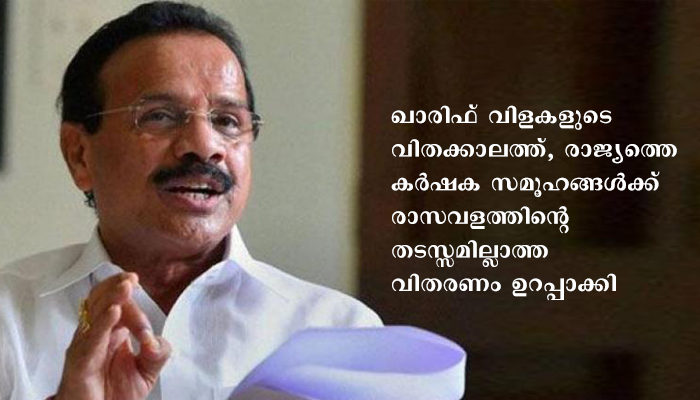 രാജ്യത്ത് ഖാരിഫ് കാലത്തിനു തുടക്കമായതായി കേന്ദ്രമന്ത്രി അറിയിച്ചു. ഇന്ത്യ യുടെ വിവിധ ഭാഗങ്ങളിൽ,കർഷകർ, കാര്‍ഷിക പ്രവർത്തനങ്ങൾ ആരംഭിച്ചു കഴിഞ്ഞു. ഈ വർഷം നല്ല കാലവര്‍ഷം  ലഭിക്കാനിടയുണ്ടെന്നും വളത്തിന്റെ ആവശ്യകത ഇക്കൊല്ലവും ഉയർന്നു നില്‍ക്കുമെന്നും  അദ്ദേഹം പ്രതീക്ഷ പ്രകടിപ്പിച്ചു.