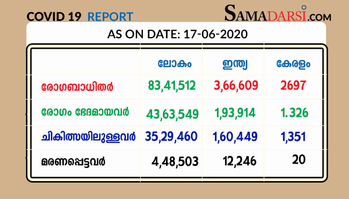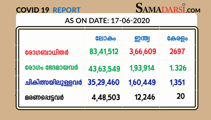 സംസ്ഥാനത്ത് ഇന്ന് 75 പേർക്കാണ് കൊറോണ സ്ഥിരീകരിച്ചത്, വിദേശത്തുനിന്ന് വന്ന അമ്പത്തി മൂന്ന് പേർക്കും മറ്റു സംസ്ഥാനങ്ങളിൽ നിന്ന് വന്ന 19 പേർക്കും മൂന്നുപേർക്ക് സമ്പർക്കം മൂലവും ആണ് രോഗം ബാധിച്ചത്. ഇതോടെ രോഗം സ്ഥിരീകരിച്ചത് 2697 പേർക്കാണ്. 1351 പേർ ചികിത്സയിൽ ഉണ്ട് . 1,25,307 പേരാണ് നിരീക്ഷണത്തിലുള്ളത്. ബുധനാഴ്ച 16 7 20-ന് മാത്രം 203 പേരാണ് ആശുപത്രിയിലായത് . 1,22,466 സാമ്പിളുകൾ പരിശോധനയ്ക്ക് അയച്ചു. 3019 പേരുടെ ഫലം വരാനുണ്ട്. സെൻറിനൽ സർവ്വേ ലെൻസ് ഭാഗമായി ശേഖരിച്ച 33,559 സാമ്പിളുകളിൽ 32,300 എണ്ണം നെഗറ്റീവ് ആയി.