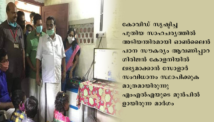 കോവിഡ് സൃഷ്ടിച്ച പുതിയ സാഹചര്യത്തില് അടിയന്തിരമായി ഓണ്ലൈന് പഠന സൗകര്യം ആവണിപ്പാറ ഗിരിജന് കോളനിയില് ലഭ്യമാക്കാന് സോളാര് സംവിധാനം സ്ഥാപിക്കുക മാത്രമായിരുന്നു എംഎല്എയുടെ മുന്പില് ഉണ്ടായിരുന്ന മാര്ഗം. അരുവാപ്പുലം ഫാര്മേഴ്സ് സഹകരണ ബാങ്കിനോട് എംഎല്എ അഭ്യര്ഥിച്ചതിനെ തുടര്ന്ന് ബാങ്ക് പ്രസിഡന്റ് കോന്നി വിജയകുമാര് സോളാര് സംവിധാനം ബാങ്കിന്റെ വകയായി നല്കാമെന്ന് എംഎല്എയെ അറിയിച്ചു. ഇതോടെ വൈദ്യുതി പ്രതിസന്ധിക്ക് പരിഹാരമായി.