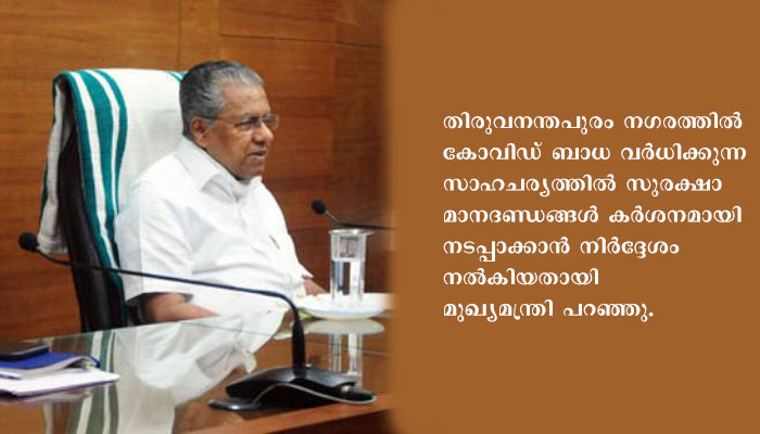 തിരുവനന്തപുരം നഗരത്തില് കോവിഡ് ബാധ വര്ധിക്കുന്ന സാഹചര്യത്തില് സുരക്ഷാ മാനദണ്ഡങ്ങള് കര്ശനമായി നടപ്പാക്കാന് നിര്ദ്ദേശം നല്കിയതായി മുഖ്യമന്ത്രി പറഞ്ഞു. ഇക്കാര്യത്തില് പൊലീസ് പ്രത്യേക ശ്രദ്ധ പതിപ്പിക്കും. ബസ് സ്റ്റോപ്പുകളിലും മാര്ക്കറ്റുകളിലും ജനങ്ങള് സാമൂഹിക അകലം പാലിക്കുന്നു വെന്ന് ഉറപ്പാക്കാന് മാത്രമായി മൂന്ന് പട്രോള് വാഹനങ്ങള് നിയോഗിച്ചിട്ടുണ്ട്.