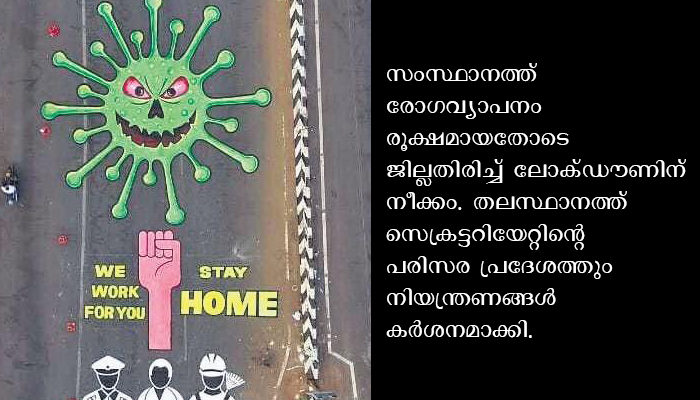 തിരുവനന്തപുരം: സംസ്ഥാനത്ത് രോഗവ്യാപനം രൂക്ഷമായതോടെ ജില്ലതിരിച്ച് ലോക്ഡൗണിന് നീക്കം. തലസ്ഥാനത്ത് സെക്രട്ടറിയേറ്റിന്റെ പരിസര പ്രദേശത്തും നിയന്ത്രണങ്ങൾ കർശനമാക്കി. ഉറവിടം അറിയാത്ത കേസുകൾ കൂടുന്നതും സർക്കാരിനെ അലട്ടുന്നുണ്ട്. രോഗിയുടെ വീട്, സ്ഥലം എന്നിവ നോക്കി ഓരോ ജില്ലതോറും കൺടൈന്മെന്റ് സോണുകൾ തീരുമാനിക്കേണ്ടി വരും. ഓഫീസുകളിൽ എല്ലാ ജീവനക്കാരും എത്തണം എന്ന നിർദ്ദേശവും പിൻവലിച്ചിട്ടുണ്ട്. ഒരാൾക്ക് രോഗബാധ ഉണ്ടായാൽ ഓഫീസ് പൂർണമായി അടച്ചിടേണ്ടി വരും എന്നതിനാലാണിത്. സംസ്ഥാനത്ത് കൺടൈന്മെന്റ് സോണുകളുടെ എണ്ണം വർദ്ധിച്ചുവരികയാണ്. സാമൂഹ്യവ്യാപനം നടന്നതായി വിദഗ്ധർ ചൂണ്ടിക്കാട്ടുന്നു ണ്ടെങ്കിലും സർക്കാർ ഇത് ഔദ്യോഗികമായി അംഗീകരിച്ചിട്ടില്ല. സർക്കാരിന്റെ സംവിധാനങ്ങൾ പാളി എന്ന് പ്രതിപക്ഷവും ബിജെപിയും ആരോപിക്കുന്നുണ്ട്.