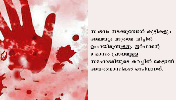 സംഭവം നടക്കുമ്പോള് കുട്ടികളും അമ്മയും മാത്രമേ വീട്ടില് ഉണ്ടായിരുന്നുള്ളു. ഇര്ഫാന്റെ 9 മാസം പ്രായമുള്ള സഹോദരിയുടെ കരച്ചില് കേട്ടാണ് അയല്വാസികള് ഓടിവന്നത്. പോലീസില് വിവരം അറിയിച്ചു. അമ്മയ്ക്ക് മാനസിക പ്രശ്നം ഉള്ളതായി സംശയിക്കുന്നു. ആലുവ സ്വദേശി സക്കീര്ഹുസൈന് ആണ് ഭര്ത്താവ്.