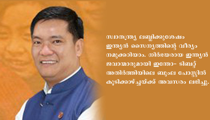 ന്യൂഡല്ഹി: ഇന്ത്യ- ചൈന അതിര്ത്തി എന്നതിനു പകരം ഇന്ത്യ- ടിബറ്റ് അതിര്ത്തി എന്ന പ്രയോഗവുമായി അരുണാചല്പ്രദേശ് മുഖ്യമന്ത്രി പെമ ഖണ്ഡു രംഗത്ത്. ബുംല പോസ്റ്റില് ഇന്ത്യന് സൈനികരുമായി നടന്ന കൂടിക്കാഴ്ച്ചയ്ക്കു ശേഷമായിരുന്നു ഖണ്ഡുവിന്റെ ട്വീറ്റ്. ”സ്വാതന്ത്ര്യ ലബ്ധിക്കുശേഷം ഇന്ത്യന് സൈന്യത്തിന്റെ വീര്യം നമുക്കറിയാം. നിര്ഭയരായ ഇന്ത്യന് ജവാന്മാരുമായി ഇന്തോ- ടിബറ്റ് അതിര്ത്തിയിലെ ബുംല പോസ്റ്റില് കൂടിക്കാഴ്ച്ചയ്ക്ക് അവസരം ലഭിച്ചു. അവരുടെ ആത്മവിശ്വാസം ഉയര്ന്ന നിലയിലാണ്. അതിര്ത്തിയില് നമ്മള് അവരുടെ കൈകളില് സുരക്ഷിതരാ”ണെന്നായിരുന്നു ഖണ്ഡുവിന്റെ ട്വീറ്റ്.