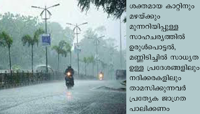 ശക്തമായ കാറ്റിനും മഴയ്ക്കും മുന്നറിയിപ്പുള്ള സാഹചര്യത്തില് ഉരുള്പൊട്ടല്, മണ്ണിടിച്ചില് സാധ്യതയുള്ള പ്രദേശങ്ങളിലും നദിക്കരകളിലും താമസിക്കുന്നവര് പ്രത്യേക ജാഗ്രത പാലിക്കണം. വെള്ളി, ശനി ദിവസങ്ങളില് കടല്ക്ഷോഭത്തിനും സാധ്യതയുണ്ട്. അതിനാല് ഈ ദിവസങ്ങളില് കേരളം, ലക്ഷദ്വീപ് തീരങ്ങളില് മത്സ്യബന്ധനം പാടില്ല.