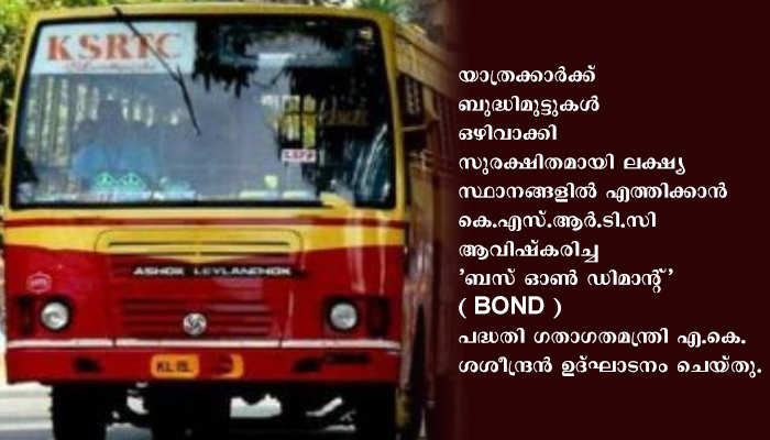 തിരുവനന്തപുരം: യാത്രക്കാര്ക്ക് ബുദ്ധിമുട്ടുകള് ഒഴിവാക്കി സുരക്ഷിതമായി ലക്ഷ്യ സ്ഥാനങ്ങളില് എത്തിക്കാന് കെ.എസ്.ആര്.ടി.സി ആവിഷ്കരിച്ച ‘ബസ് ഓണ് ഡിമാന്റ്’ ( BOND ) പദ്ധതി ഗതാഗതമന്ത്രി എ.കെ. ശശീന്ദ്രന് ഉദ്ഘാടനം ചെയ്തു.