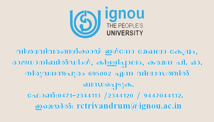 വിശദവിവരങ്ങൾക്കായ് ഇഗ്നോ മേഖലാ കേന്ദ്രം, രാജധാനിബിൽഡിംഗ്, കിള്ളിപ്പാലം, കരമന പി. ഓ. തിരുവനന്തപുരം 695002 എന്ന വിലാസത്തിൽ ബന്ധപ്പെടുക.ഫോൺ:0471-2344113 /2344120 / 9447044132.