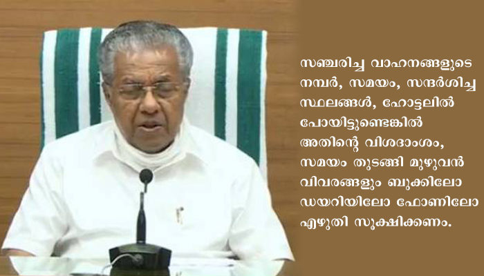 തിരുവനന്തപുരം: ഓരോ ദിവസത്തെയും യാത്രാ വിവരങ്ങള് എല്ലാവരും എഴുതി സൂക്ഷിക്കണമെന്ന് മുഖ്യമന്ത്രി പിണറായി വിജയന് പറഞ്ഞു. സഞ്ചരിച്ച വാഹനങ്ങളുടെ നമ്പര്, സമയം, സന്ദര്ശിച്ച സ്ഥലങ്ങള്, ഹോട്ടലില് പോയിട്ടുണ്ടെങ്കില് അതിന്റെ വിശദാംശം, സമയം തുടങ്ങി മുഴുവന് വിവരങ്ങളും ബുക്കിലോ ഡയറിയിലോ ഫോണിലോ എഴുതി സൂക്ഷിക്കണം.