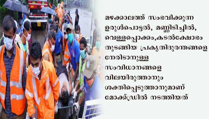 ജില്ലയില് മഴക്കാലത്ത് ഉണ്ടാകുന്ന ഉരുള്പൊട്ടല്, മണ്ണിടിച്ചില്, വെള്ളപ്പൊക്കം, കടല്ക്ഷോഭം തുടങ്ങിയ പ്രകൃതിദുരന്തങ്ങളെ നേരിടാനുള്ള സംവിധാനങ്ങളെ വിലയിരുത്താനും ശക്തിപ്പെടുത്താനുമാണ് മോക്ക്ഡ്രില് നടത്തിയത്. കോവിഡ് 19 നിര്ദേശങ്ങള് പാലിച്ചുകൊണ്ട് നടത്തിയ മോക്ക്ഡ്രില്ലില് വിവിധ വകുപ്പുകളുടെ ഏകോപനവും വകുപ്പുകള് തമ്മിലുള്ള ആശയ വിനിമയവും വിലയിരുത്തി.