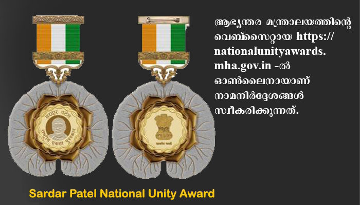 ന്യൂഡൽഹി: രാജ്യത്തിന്റെ ഐക്യത്തിനും ദേശീയോദ്ഗ്രഥനത്തിനും മികച്ച സംഭാവന നൽകുന്നവർക്കു നൽകുന്ന പരമോന്നത സിവിലിയൻ പുരസ്കാരമായ സർദാർ പട്ടേൽ നാഷനൽ യൂണിറ്റി അവാർഡ് -2020 നുള്ള ഓൺലൈൻ നാമനിർദ്ദേശ നടപടിക്രമങ്ങൾ 15.08.2020 വരെ നീട്ടി.