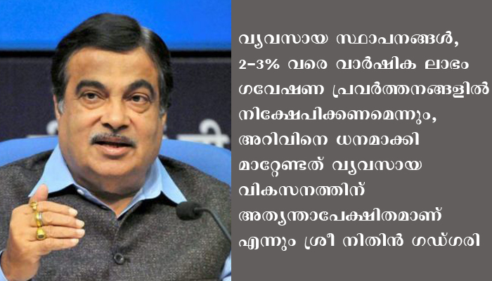 വ്യവസായ സ്ഥാപനങ്ങള്‍, 2-3% വരെ വാര്‍ഷിക ലാഭം ഗവേഷണ പ്രവര്‍ത്തനങ്ങളില്‍ നിക്ഷേപിക്കണമെന്നും, അറിവിനെ ധനമാക്കി മാറ്റേണ്ടത് വ്യവസായ വികസനത്തിന് അത്യന്താപേക്ഷിതമാണെന്നും ശ്രീ‍ ഗഡ്ഗരി അഭിപ്രായപ്പെട്ടു. എഞ്ചിനീയറിംഗ് എക്‌പോര്‍ട്ട്‌സ് പ്രൊമോഷന്‍ കൗണ്‍സില്‍ പ്രതിനിധികളോട്, അവരുടെ നിര്‍ദ്ദേശങ്ങള്‍ സമര്‍പ്പിക്കാനും ഗവണ്‍മെന്റ് എല്ലാവിധ പിന്തുണയും നല്‍കുമെന്നും മന്ത്രി പറഞ്ഞു.