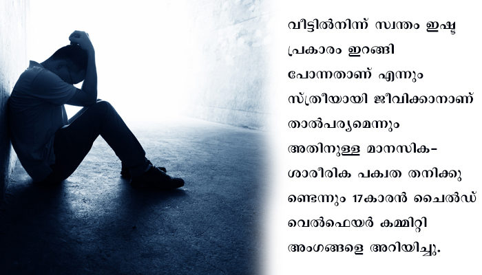 മലപ്പുറം: സ്ത്രീയായി ജീവിക്കാന് അനുവദിക്കണമെന്ന ആവശ്യവുമായി ചൈല്ഡ് വെല്ഫെയര് കമ്മിറ്റി മുമ്പാകെ 17കാരന്. ഇതിന്റെ പേരില് വീട്ടുകാരുമായി തെറ്റി വീടുവിട്ടിറങ്ങിയ കുട്ടിയെ സിഡബ്ല്യുസിക്കു മുമ്പാകെ ഹാജരാക്കുകയായിരുന്നു. മലപ്പുറത്താണ് സംഭവം. വീട്ടില്നിന്ന് സ്വന്തം ഇഷ്ടപ്രകാരം ഇറങ്ങിപ്പോന്നതാണെന്നും സ്ത്രീയായി ജീവിക്കാനാണ് താല്പര്യമെന്നും അതിനുള്ള മാനസിക- ശാരീരിക പക്വത തനിക്കുണ്ടെന്നും 17കാരന് ചൈല്ഡ് വെല്ഫെയര് കമ്മിറ്റി അംഗങ്ങളെ അറിയിച്ചു. ട്രാന്സ്ജെന്ഡര് വിഭാഗത്തിലുള്ള ആള്ക്കൊപ്പം താമസിക്കാനാണ് താല്പര്യമെന്നും വ്യക്തമാക്കി.