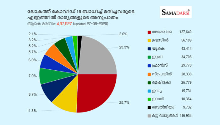 27-06-2020 രാത്രി 11മണിയ്ക്കുള്ള കണക്കനുസരിച്ച് ലോകത്ത് കൊറോണ ബാധിതര് ഒരു ലക്ഷത്തിനു മുകളിലായി. 10,000,453പേര്. 4,98953 പേര് മരിച്ചു. 40,86,826 പേര് ചികിത്സയിലുണ്ട്. ഏറ്റവും കൂടുതല് രോഗികളുള്ളത് യു എസ് എ-യിലാണ് 25,77,924 പേര്. അടുത്ത സ്ഥാനം ബ്രസീലിനാണ്. 12,84,214 പേര്. മൂന്നാം സ്ഥാനം റഷ്യയ്ക്ക്. 6,27,646പേര്. നാലാം സ്ഥാനമാണ് ഇന്ത്യയ്ക്ക്. 5,29,331 പേര്ക്ക് ഇതുവരെ രോഗം ബാധിച്ചു. 16,103 പേര് മരിച്ചു. 2,03,082 പേര് ഇപ്പോള് ചികിത്സയിലുണ്ട്.