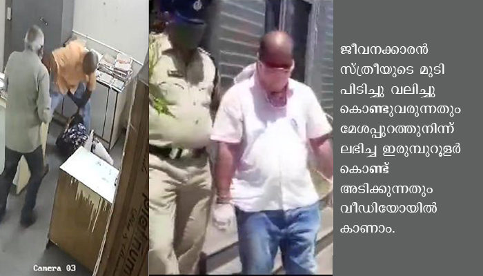 ജീവനക്കാരന് സ്ത്രീയുടെ മുടി പിടിച്ചു വലിച്ചു കൊണ്ടു വരുന്നതും മേശപ്പുറത്തുനിന്ന് ലഭിച്ച ഇരുമ്പു റൂളര്കൊണ്ട് അടിക്കുന്നതും വീഡിയോയില് കാണാം. ഈ ക്രൂരകൃത്യം തടയാന് ചെന്ന പ്രായമായ മറ്റൊരു ജീവനക്കാരനേയും അയാള് തള്ളിയിടുന്നുണ്ട്. അക്രമം നിര്ത്താതെ വന്നപ്പോള് അവിടത്തെ മറ്റുള്ള ജീവനക്കാരെല്ലാവരും ചേര്ന്ന് അയാളെ പിടിച്ചു മാറ്റി. പോലീസ് അയാള്ക്കെതിരെ കേസെടുത്തു. അറസ്റ്റുചെയ്തു.