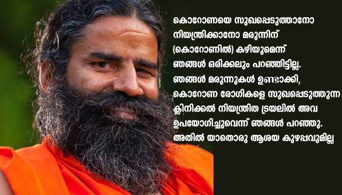 കൊറോണയെ സുഖപ്പെടുത്താനോ നിയന്ത്രിക്കാനോ മരുന്നിന് (കൊറോണില്) കഴിയുമെന്ന് ഞങ്ങള് ഒരിക്കലും പറഞ്ഞിട്ടില്ല. ഞങ്ങള് മരുന്നുകള് ഉണ്ടാക്കി, കൊറോണ രോഗികളെ സുഖപ്പെടുത്തുന്ന ക്ലിനിക്കല് നിയന്ത്രിത ട്രയലില് അവ ഉപയോഗിച്ചുവെന്ന് ഞങ്ങള് പറഞ്ഞു. അതില് യാതൊരു ആശയ കുഴപ്പവുമില്ല -കമ്പനി ചീഫ് എക്സിക്യുട്ടീവ് ഓഫീസര് ആചാര്യ ബാലകൃഷ്ണ വാര്ത്താ ഏജന്സിയായ എ.എന്.ഐയോട് പറഞ്ഞു.