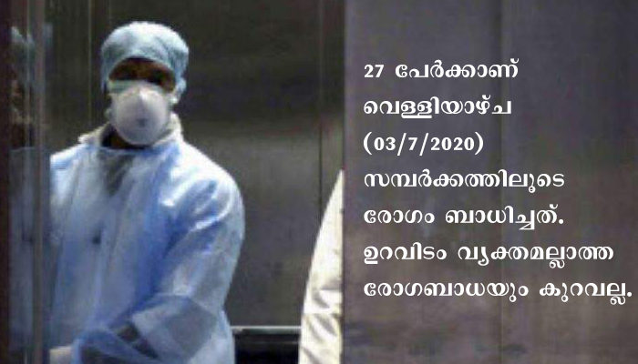 തിരുവനന്തപുരം : സംസ്ഥാനത്ത് സമ്പർക്കത്തിലൂടെ കൊറോണ രോഗം ബാധിക്കുന്നവരുടെ എണ്ണം കൂടിവരുന്നു. 27 പേർക്കാണ് വെള്ളിയാഴ്ച (03/-7/2020) സമ്പർക്കത്തിലൂടെ രോഗം ബാധിച്ചത്. ഉറവിടം വ്യക്തമല്ലാത്ത രോഗബാധയും കുറവല്ല.