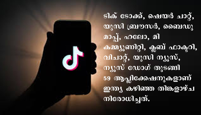 ടിക് ടോക്ക്, ഷെയര് ചാറ്റ്, യുസി ബ്രൗസര്, ബൈഡു മാപ്പ്, ഹലോ, മി കമ്മ്യൂണിറ്റി, ക്ലബ് ഫാക്ടറി, വിചാറ്റ്, യുസി ന്യൂസ്, ന്യൂസ് ഡോഗ് തുടങ്ങി 59 ആപ്ലിക്കേഷനുകളാണ് ഇന്ത്യ കഴിഞ്ഞ തിങ്കളാഴ്ച നിരോധിച്ചത്.
