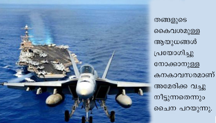 ചൈന നാവികാഭ്യാസം നടത്തുന്നതിനിടയിലാണ് അമേരിക്കന് വിമാനവാഹിനികള് ചൈനയ്ക്ക് അടുത്തുവന്ന് നങ്കൂരമിട്ട് നാവികാഭ്യാസം ആരംഭിച്ചിരിക്കുന്നത്. ഡിഎഫ്- 21 ഡി, ഡിഎഫ്- 26 തുടങ്ങിയ ശക്തമായ മിസൈലുകള് ചൈനയ്ക്ക് ഉണ്ടെന്നും ദക്ഷിണ ചൈന കടല് പൂര്ണമായും ചൈനയുടെ അധീനതയില് ആണെന്നും അമേരിക്ക പഴയ അമേരിക്ക അല്ലെന്ന ഓര്മവേണമെന്നും ഗ്ലോബല് ടൈംസ് അമേരിക്കയ്ക്ക് മുന്നറിയിപ്പ് നല്കുന്നു.