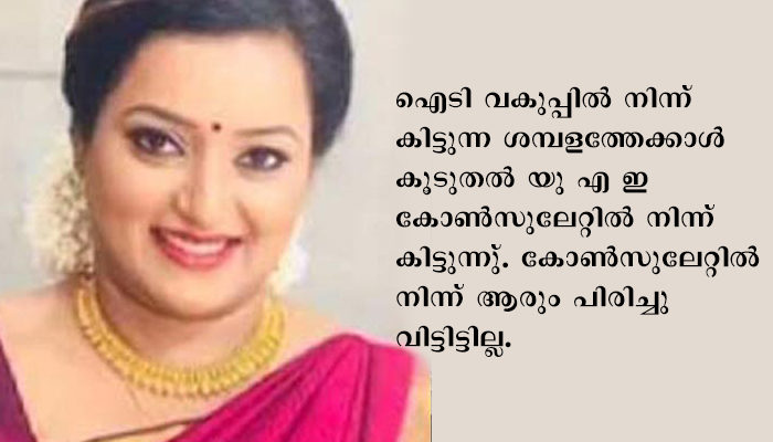 ഐടി വകുപ്പിൽ നിന്ന് കിട്ടുന്ന ശമ്പളത്തേക്കാൾ കൂടുതൽ യു എ ഇ കോൺസുലേറ്റിൽ നിന്ന് കിട്ടുന്നുണ്ട്. കോൺസുലേറ്റിൽ നിന്ന് ആരും പിരിച്ചു വിട്ടിട്ടില്ല. കഴിഞ്ഞ ഞായറാഴ്ച വരെ കോൺസുലേറ്റ് ജനറൽ ആവശ്യപ്പെട്ട കാര്യങ്ങൾ ചെയ്തിരുന്നു. യുഎഇ യെ ചതിക്കുന്ന ഒന്നും ചെയ്യില്ല. അവിടെ ജനിച്ചുവളർന്നതിന്‍റെ സ്നേഹമാണ് അത്. കോൺസുലേറ്റ് ജനറൽ ഫോണിൽ വിളിച്ച് ഇടപെടാൻ ആവശ്യപ്പെട്ടത് കൊണ്ട് മാത്രമാണ് കസ്റ്റംസിലെ രാമമൂർത്തി എന്ന സാറിനെ വിളിച്ചത്. ഒരു കാർഗോ വന്നിട്ടുണ്ട് , വിട്ടു കിട്ടിയിട്ടില്ല അത് അന്വേഷിക്കണം എന്ന് കോൺസൽ ജനറൽ ആവശ്യപ്പെട്ടതു കൊണ്ടാണ് കസ്റ്റംസിലെ ഉദ്യോഗസ്ഥനെ വിളിച്ചത്. അതിനപ്പുറം യാതൊരു ബന്ധവും ഈ സംഭവവുമായി ഇല്ല.