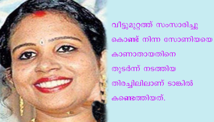 ബുധനാഴ്ചയായിരുന്നു സംഭവം. വീട്ടുമുറ്റത്ത് സംസാരിച്ചു കൊണ്ട് നിന്ന സോണിയയെ കാണാതായതിനെ തുടർന്ന് നടത്തിയ തിരച്ചിലിലാണ് ടാങ്കിൽ കണ്ടെത്തിയത്.