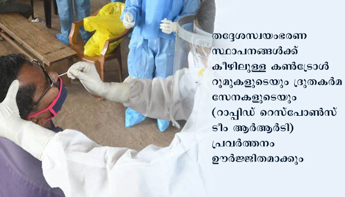 തദ്ദേശസ്വയംഭരണ സ്ഥാപനങ്ങള്ക്ക് കീഴിലുള്ള കണ്ട്രോള് റൂമുകളുടെയും ദ്രുതകര്മ സേനകളുടെയും (റാപ്പിഡ് റെസ്പോണ്സ് ടീം- ആര്ആര്ടി) പ്രവര്ത്തനം ഊര്ജ്ജിതമാക്കും. ക്വാറന്റീനില് കഴിയുന്നവരുടെ ഗൃഹസന്ദര്ശനം നൂറു ശതമാനം ഉറപ്പുവരുത്തും. ആര്ആര്ടികളുമായി ബന്ധപ്പെട്ട പ്രവര്ത്തനങ്ങള് ക്കായി 1,500 ജീവനക്കാരെ തദ്ദേശ സ്വയംഭരണ സ്ഥാപനങ്ങളിലേക്ക് അനുവദിച്ചിട്ടുണ്ട്.