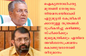 തിരുവനന്തപുരം : ഐക്യജനാധിപത്യ മുന്നണി നേതൃത്വം സമരം ശക്തിപ്പെടുത്തുകയാണ്. നിയമസഭയിലേക്ക് ഏറ്റുമുട്ടൽ കേന്ദ്രീകരിക്കാനുള്ള തന്ത്രങ്ങൾ രൂപീകരിച്ചു കഴിഞ്ഞു. സ്പീക്കർക്കും മുഖ്യമന്ത്രിക്കും എതിരെ അവിശ്വാസപ്രമേയം കൊണ്ടുവരാനാണ് തീരുമാനം. മുഖ്യമന്ത്രിയുടെ പ്രിൻസിപ്പൽ സെക്രട്ടറി ആയിരുന്ന എം ശിവശങ്കരന് സ്വർണക്കടത്തിലെ മുഖ്യപ്രതികളായ സ്വപ്ന സുരേഷും സന്ദീപ് നായരുമായുള്ള ബന്ധം തെളിയിക്കുന്ന രേഖകൾ സന്ദീപ് നായരുടെ വീട്ടിൽ നടത്തിയ റെയ്ഡിൽ കസ്റ്റംസ് പിടിച്ചെടുത്തിരുന്നു. ഇത്രയും ഗുരുതരമായ കുറ്റകൃത്യം രാജ്യത്തിൻറെ ചരിത്രത്തിൽ ആദ്യമായി ഒരു മുഖ്യമന്ത്രിയുടെ ഓഫീസ് കേന്ദ്രീകരിച്ച് സംഭവിച്ചിട്ടും അതിൽപെട്ടു നിൽക്കുന്ന പ്രിൻസിപ്പൽ സെക്രട്ടറിക്കെതിരെ നടപടിയെടുക്കാതെ സംരക്ഷിക്കുന്നത് മുഖ്യമന്ത്രിതന്നെ സംഭവത്തിൽ പങ്കുള്ളതുകൊണ്ടാണ് എന്ന ആരോപണമാണ് യുഡിഎഫ് ഉയർത്തുന്നത്. മുഖ്യപ്രതികളിലൊരാളായ സന്ദീപ് നായരുടെ നെടുമങ്ങാടുള്ള കാർബൺ ഡോക്ടർ എന്ന സ്ഥാപനത്തിൻറെ ഉദ്ഘാടനം നിർവഹിച്ചത് സ്പീക്കർ ശ്രീരാമകൃഷ്ണൻ ആയിരുന്നു. വ്യക്തിപരമായ അടുപ്പം ഉള്ളതുകൊണ്ടാണ് സ്വകാര്യവ്യക്തിയുടെ സ്ഥാപനത്തിൻറെ ഉദ്ഘാടനത്തിന് പോയത് എന്ന് ചൂണ്ടിക്കാട്ടിയാണ് യുഡിഎഫ് ആക്രമണം. കള്ളക്കടത്ത് സംഘവുമായി ശിവശങ്കരൻ നേരിട്ട് ബന്ധപ്പെട്ടിരുന്നുവെന്ന് തെളിവുകൾ കസ്റ്റംസ് ശേഖരിച്ചിട്ടുണ്ട്. സംശയത്തിന് കരിനിഴലിൽ മുഖ്യമന്ത്രിയുടെ പ്രിൻസിപ്പൽ സെക്രട്ടറി വന്നുപെട്ട സാഹചര്യത്തിൽ പോലും അച്ചടക്ക നടപടിയുമായി സർക്കാർ മുന്നോട്ടു വരാത്തതിൽ ആണ് ഇപ്പോൾ വിമർശനം കേന്ദ്രീകരിച്ചിരിക്കുന്നത്. ബിജെപി സംസ്ഥാന പ്രസിഡണ്ട് കെ. സുരേന്ദ്രനും ഈ വശങ്ങൾ ചൂണ്ടിക്കാട്ടി രംഗത്തുവന്നിട്ടുണ്ട്.