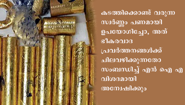 കടത്തിക്കൊണ്ട് വരുന്ന സ്വർണ്ണം പണമായി ഉപയോഗിച്ചോ, അത് ഭീകരവാദ പ്രവർത്തനങ്ങള്ക്ക് ചിലവഴിക്കുന്നതോ സംബന്ധിച്ച് എൻ ഐ എ വിശദമായി അന്വേഷിക്കും. കേസ് എൻ ഐ എ യ്ക്ക് വിട്ടതായ ഉത്തരവ് കേന്ദ്ര മന്ത്രാലയും പുറത്തിറക്കി. ദേശീയ, അന്തർ ദേശീയ ബന്ധങ്ങൾ അന്വേഷിക്കണമെന്നും ഉത്തരവിൽ വ്യക്തമാക്കിയിട്ടുണ്ട്.