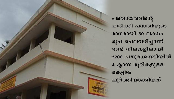 വിദ്യാർത്ഥികൾക്ക് കൂടുതൽ സൗകര്യം ഒരുക്കുകയെന്ന ലക്ഷ്യത്തോടെ 2017 -18 വർഷത്തിലാണ് ജില്ലാ പഞ്ചായത്ത് സ്കൂൾ കെട്ടിട നിർമ്മാണം ആരംഭിച്ചത്. പഞ്ചായത്തിന്റെ ഹരിശ്രീ പദ്ധതിയുടെ ഭാഗമായി 50 ലക്ഷം രൂപ ചെലവഴിച്ചാണ് രണ്ട് നിലകളിലായി 2200 ചതുരശ്രയടിയിൽ 4 ക്ലാസ് മുറികളുള്ള കെട്ടിടം പൂർത്തിയാക്കിയത്.