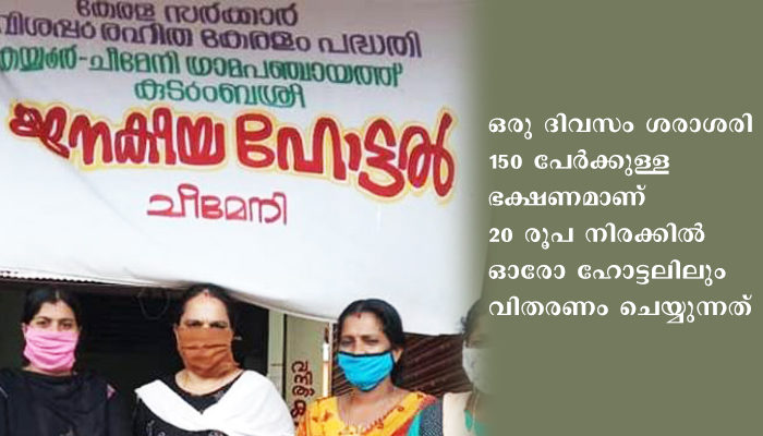കാസര്‍കോട് : ഇരുപത് രൂപയ്ക്ക് ഭക്ഷണം നല്‍കി സാധാരണക്കാരന്റെ വിശപ്പകറ്റാന്‍ ജില്ലയില്‍ പ്രവര്‍ത്തിക്കുന്നത് 12 കുടുംബശ്രീ ജനകീയ ഹോട്ടലുകള്‍. ഒരു ദിവസം ശരാശരി 150 പേര്‍ക്കുള്ള ഭക്ഷണമാണ് 20 രൂപ നിരക്കില്‍ ഓരോ ഹോട്ടലിലും വിതരണം ചെയ്യുന്നത്. സര്‍ക്കാറിന്റെ സ്വപ്ന പദ്ധതികളില്‍ ഒന്നായ ജനകീയ ഹോട്ടല്‍ ജില്ലയില്‍ പ്രവര്‍ത്തനം ആരംഭിച്ച് മൂന്ന് മാസം പിന്നിടുമ്പോള്‍ ജനകീയ പിന്‍തുണ ഏറുകയാണ്. ജില്ലയിലെ ആദ്യ ജനകീയ ഹോട്ടല്‍ ഏപ്രില്‍ ഏഴിന് തൃക്കരിപ്പൂര്‍ പഞ്ചായത്തില്‍ തുറന്നു. ശേഷം ഇതുവരെ വിവിധ പഞ്ചായത്തുകളിലായി 12 ജനകീയ ഹോട്ടലുകളാണ് പ്രവര്‍ത്തിക്കുന്നത്. പകല്‍ 12 മുതല്‍ വൈകീട്ട് മൂന്ന് വരെയുള്ള സമയത്താണ് 20 രൂപയ്ക്ക് ഊണ്‍ ലഭിക്കുക. ചോറ്, ഒഴിച്ചുകറി, തോരന്‍, അച്ചാര്‍ എന്നിവയടങ്ങിയ മികച്ച ഭക്ഷണമാണ് കുടുംബശ്രീ ജനകീയ ഹോട്ടലിലൂടെ ലഭിക്കുക. ഊണിനോടൊപ്പം കൂടുതലായി നല്‍കുന്ന മീന്‍ വറത്തത്, ഓംലറ്റ് എന്നിവയ്ക്ക് സാധാരണ നിരക്ക് ഈടാക്കി വരുന്നു. 20രൂപയ്ക്ക് ഊണ്‍ നല്‍കുന്നതോടൊപ്പം പ്രാതല്‍, അത്താഴം എന്നിവയും ഹോട്ടലുകളില്‍ ലഭിക്കും. പ്രാതലിനും അത്താഴത്തിനും സാധാരണ വിലയാണ് ഈടാക്കി വരുന്നത്.