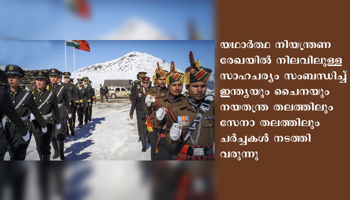 തിരുവനന്തപുരം: യഥാർത്ഥ നിയന്ത്രണരേഖയിൽ നിലവിലുള്ള സാഹചര്യം സംബന്ധിച്ച് ഇന്ത്യയും ചൈനയും നയതന്ത്ര തലത്തിലുo സേനാ തലത്തിലും ചർച്ചകൾ നടത്തി വരുന്നു. ചൈനീസ് സേനയായ പീപ്പിൾസ് ലിബറേഷൻ ആർമി യിലെയും ഇന്ത്യൻ കരസേനയിലെയും കമാൻഡർമാർ ജൂലൈ 14ന് ചുഷുളിൽ നാലാം ഘട്ട ചർച്ച നടത്തി. സേനകളുടെ പൂർണമായ പിന്മാറ്റം സംബന്ധിച്ച് ജൂലൈ അഞ്ചിന് ഇരുരാജ്യങ്ങളിലെയും പ്രത്യേക പ്രതിനിധികൾ എത്തിച്ചേർന്ന സമവായത്തിന് തുടർച്ചയായാണ് ഈ ചർച്ച നടന്നത്.