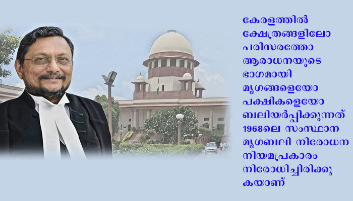 കേരളത്തില്‍ ക്ഷേത്രങ്ങളിലോ പരിസരത്തോ ആരാധനയുടെ ഭാഗമായി മൃഗങ്ങളെയോ പക്ഷികളെയോ ബലിയര്‍പ്പിക്കുന്നത് 1968ലെ സംസ്ഥാന മൃഗബലി നിരോധന നിയമപ്രകാരം നിരോധിച്ചിരിക്കുകയാണ്. മൃഗബലി നടത്തിയാല്‍ ഈ നിയമപ്രകാരം മൂന്നുമാസം തടവും 300 രൂപവരെ പിഴയുമാണ് ശിക്ഷ. മൃഗബലി നിരോധന നിയമം നടപ്പാക്കാനുള്ള സര്‍ക്കാരിന്റെ ഉത്തരവിനെതിരേ ഹൈക്കോടതിയില്‍ സമര്‍പ്പിച്ച ഹര്‍ജി ജൂണ്‍ 16ന് കോടതി തള്ളിയിരുന്നു. ഇതിനെ ത്തുടര്‍ന്നാണ് ഭരണഘടനയുടെ 25(1) അനുച്ഛേദനത്തിന്റെ ലംഘനമാണ് മൃഗബലി നിരോധന നിയമമെന്ന് കാട്ടി സുപ്രിംകോടതിയെ സമീപിച്ചത്.