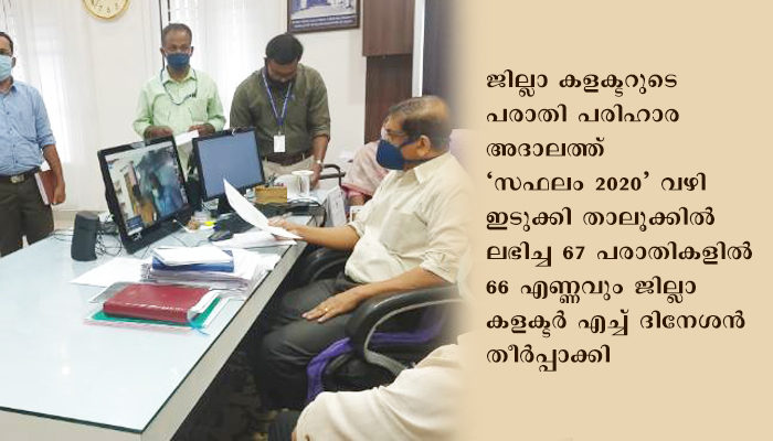 ഇടുക്കി : ജില്ലാ കളക്ടറുടെ പരാതി പരിഹാര അദാലത്ത് ‘സഫലം 2020’ വഴി ഇടുക്കി താലൂക്കില് ലഭിച്ച 67 പരാതികളില് 66 എണ്ണവും ജില്ലാ കളക്ടര് എച്ച് ദിനേശന് തീര്പ്പാക്കി. ഒരെണ്ണം തുടര് നടപടികള്ക്കായി മാറ്റി. ഇടുക്കി താലൂക്കിലും താലൂക്കിന് കീഴിലുള്ള പത്ത് വില്ലേജ് ഓഫീസുകളിലുമായി 48 പരാതിക്കാര് വീഡിയോ കോണ്ഫറന്സിലൂടെ അദാലത്തില് പങ്കെടുത്തു. അദാലത്തില് പങ്കെടുക്കാതിരുന്നവര്ക്ക് പരാതിയിന് മേല് സ്വീകരിച്ച നടപടി ഓണ്ലൈനായി അറിയുവാന് കഴിയും.