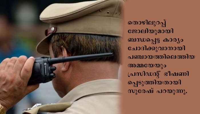 ഇതിന് ശേഷം തൊഴിലുറപ്പ് ജോലിയുമായി ബന്ധപ്പെട്ട കാര്യം ചോദിക്കുവാനായി പഞ്ചായത്തിലെത്തിയ തന്നെയും പ്രസിഡന്റ് ഭീഷണിപ്പെടുത്തിയതായി സുരേഷിന്റെ അമ്മയും പറയുന്നു.