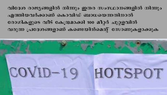 ഇവിടങ്ങളില് വിദേശ രാജ്യങ്ങളില് നിന്നും ഇതര സംസ്ഥാനങ്ങളില് നിന്നും എത്തിയവര്ക്കാണ് കൊവിഡ് ബാധയെന്നതിനാല് രോഗികളുടെ വീട് കേന്ദ്രമാക്കി 100 മീറ്റര് ചുറ്റളവില് വരുന്ന പ്രദേശങ്ങളാണ് കണ്ടെയിന്മെന്റ് സോണുകളാക്കുക.