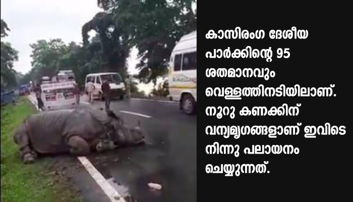 കാസിരംഗ ദേശീയ പാര്ക്കിന്റെ 95 ശതമാനവും വെള്ളത്തിനടിയിലാണ്. നൂറു കണക്കിന് വന്യമൃഗങ്ങളാണ് ഇവിടെ നിന്നു പലായനം ചെയ്യുന്നത്.