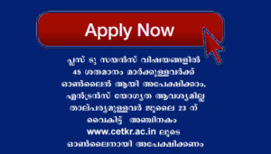കേപ്പിന്റെ കീഴില് ചീമേനിയിലുള്ള തൃക്കരിപ്പൂര് എഞ്ചിനീയറിങ്് കോളേജില് ബി ടെക് എന്. ആര്. ഐ സീറ്റില്, സിവില് എഞ്ചിനീയറിങ്, കമ്പ്യൂട്ടര് സയന്സ്, ഇലക്ട്രിക്കല് ആന്ഡ് ഇലക്ട്രോണിക്, ഇലക്ട്രോണിക്സ് ആന്ഡ് കമ്മ്യൂണിക്കേഷന് ബ്രാഞ്ചുകളിലേക്കുള്ള ഒന്നാം ഘട്ട അലോട്മെന്റ് ജൂലൈ 24 ന് നടക്കും. പ്ലസ് ടു സയന്സ് വിഷയങ്ങളില് 45 ശതമാനം മാര്ക്കുള്ളവര്ക്ക് ഓണ്ലൈന് ആയി അപേക്ഷിക്കാം. എന്ട്രന്സ് യോഗ്യത ആവശ്യമില്ല. താല്പര്യമുള്ളവര് ജൂലൈ 23 ന് വൈകിട്ട് അഞ്ചിനകം www.cetkr.ac.in ലൂടെ ഓണ്ലൈനായി അപേക്ഷിക്കണം. കൂടുതല് വിവരങ്ങള്ക്ക് 0467 2250377, 9400808443, 9847690280