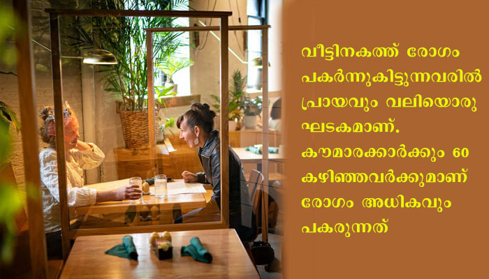 വീട്ടിനകത്ത് രോഗം പകര്‍ന്നുകിട്ടുന്നവരില്‍ പ്രായവും വലിയൊരു ഘടകമാണ്. കൗമാരക്കാര്‍ക്കും 60 കഴിഞ്ഞവര്‍ക്കുമാണ് രോഗം അധികവും പകരുന്നത്. ഇവരാണല്ലോ മറ്റുള്ളവരെ ആശ്രയിച്ച് കഴിയുന്നവര്‍ ഏറിയ പങ്കും. അതുപോലെ ചെറിയ കുട്ടികളില്‍ കൊവിഡ് ലക്ഷണങ്ങള്‍ പ്രകടമാവുന്നില്ലെന്നും പഠനം പറയുന്നു. എന്നാല്‍, ഇക്കാര്യം സ്ഥിരീകരിക്കണമെങ്കില്‍ കൂടുതല്‍ പഠനം ആവശ്യമാണെന്നും ഗവേഷകസംഘം പറയുന്നു.