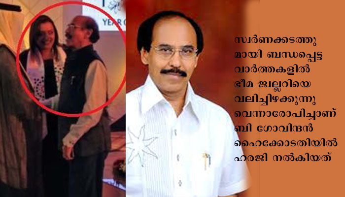 കൊച്ചി: സ്വര്‍ണക്കടത്ത് കേസുമായി ബന്ധപ്പെട്ട് തനിക്കെതിരേ സോഷ്യല്‍ മീഡിയയില്‍ പ്രചരിക്കുന്ന പോസ്റ്റുകള്‍ നീക്കം ചെയ്യണമെന്ന ഭീമ ജ്വല്ലറി ഉടമ ബി ഗോവിന്ദന്റെ ആവശ്യം ഹൈക്കോടതി തള്ളി. തിരുവനന്തപുരം രാജ്യാന്തര വിമാനത്താവളം വഴി ഡിപ്ലോമാറ്റ് ചാനല്‍വഴി നടത്തിയ സ്വര്‍ണക്കടത്തുമായി ബന്ധപ്പെട്ട വാര്‍ത്തകളില്‍ ഭീമ ജ്വല്ലറിയെ വലിച്ചിഴക്കുന്നുവെന്നാരോപിച്ചാണ് ബി ഗോവിന്ദന്‍ ഹൈക്കോടതിയില്‍ ഹരജി നല്‍കിയത്. കോണ്‍ഗ്രസ് നേതാവ് നിയാസ് ഭാരതി, അഡ്വ. ഹരീഷ് വാസുദേവന്‍ തുടങ്ങിയവരെ എതിര്‍കക്ഷികളാക്കിയാണ് പരാതി നല്‍കിയത്.