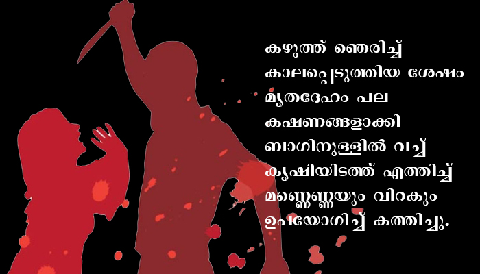 കഴുത്ത് ഞെരിച്ച് കാലപ്പെടുത്തിയ ശേഷം മൃതദേഹം പല കഷണങ്ങളാക്കി ബാഗിനുള്ളിൽ വച്ച് കൃഷിയിടത്ത് എത്തിച്ച് മണ്ണെണ്ണയും വിറകും ഉപയോഗിച്ച് കത്തിച്ചു. ബാക്കി ഭാഗങ്ങൾ സമീപത്തെ ജലാശയത്തിന് സമീപം ഉപേക്ഷിച്ചു.