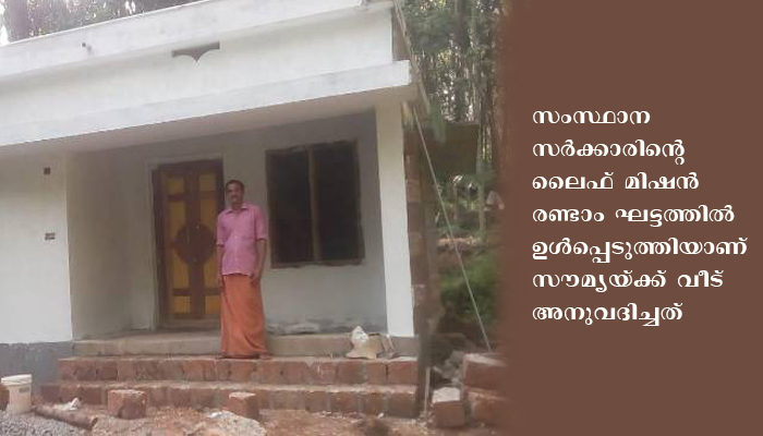 മകള് വളര്ന്നു തുടങ്ങിയപ്പോള് അടച്ചുറപ്പുള്ള സുരക്ഷിതമായ ഒരു വീടെന്നത് വലിയ ആവശ്യമായി. കൂലിപ്പണി ചെയ്ത് കിട്ടുന്ന തുച്ഛമായ കൂലി കൂട്ടിവെച്ച് ബളാലില് അത്യാവശ്യം ഗതാഗത സൗകര്യമുള്ള സ്ഥലത്ത് കുറച്ച് ഭൂമി വാങ്ങി. അപ്പോഴും അവിടെ ഒരു വീട് എന്നത് അവരുടെ സ്വപ്നം മാത്രമായി. നെഞ്ചിലെ ആധി കൂടി കൂടി വരുന്ന സമയത്തായിരുന്നു, സംസ്ഥാന സര്ക്കാരിന്റെ ലൈഫ് മിഷന് രണ്ടാം ഘട്ടത്തില് ഉള്പ്പെടുത്തി സൗമ്യയ്ക്ക് വീട് അനുവദിക്കുന്നത്. സര്ക്കാര് ധനസഹായത്താല് ഈ കുടുംബത്തിന്റെ സ്വപ്ന വീട് ബളാലില് ഒരുങ്ങി. സ്കൂള് വിദ്യാര്ത്ഥിനിയായ മകള്ക്കൊപ്പം സൗമ്യയും പ്രദീപനും ഇപ്പോള് സന്തുഷ്ടരാണ്.