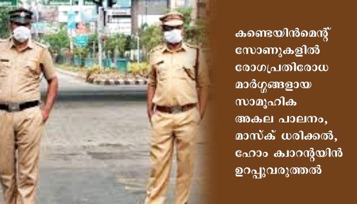 ജില്ലാ മജിസ്ട്രേറ്റ് കണ്ടെയിന്മെന്റ് സോണുകളായി പ്രഖ്യാപിക്കുന്ന സ്ഥലങ്ങളില് ഏര്പ്പെടുത്തേണ്ട നിയന്ത്രണങ്ങളെ സംബന്ധിച്ച് ബന്ധപ്പെട്ട ജില്ലാ പോലീസ് മേധാവി വ്യക്തമായ നിര്ദ്ദേശങ്ങള് പുറപ്പെടുവിച്ച് അവ കര്ശനമായി പാലിക്കുന്നെന്ന് ഉറപ്പുവരുത്തണം. കണ്ടെയിന്മെന്റ് സോണുകളില് രോഗപ്രതിരോധ മാര്ഗ്ഗങ്ങളായ സാമൂഹിക അകല പാലനം, മാസ്ക് ധരിക്കല്, ഹോം ക്വാറന്റയിന് ഉറപ്പുവരുത്തല്, അനാവശ്യ യാത്രകള് ഒഴിവാക്കല് തുടങ്ങിയവ ബന്ധപ്പെട്ട ജില്ലാ പോലീസ് ഉറപ്പാക്കണം.