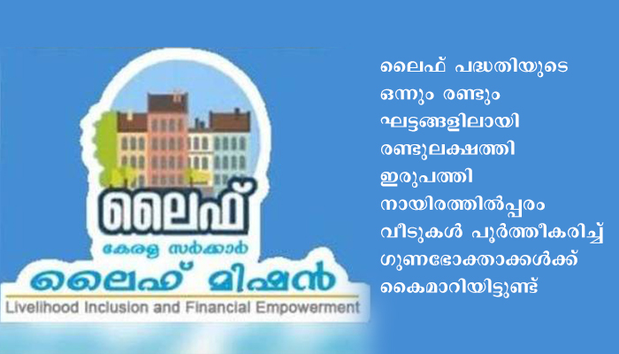 ലൈഫ് പദ്ധതിയുടെ ഒന്നും രണ്ടും ഘട്ടങ്ങളിലായി രണ്ടുലക്ഷത്തി ഇരുപതിനായിരത്തില്പ്പരം വീടുകള് പൂര്ത്തീകരിച്ച് ഗുണഭോക്താക്കള്ക്ക് കൈമാറിയിട്ടുണ്ട്.