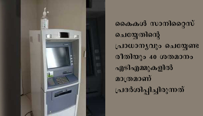 കാസര്കോട് മുതല് തിരുവനന്തപുരം വരെയുള്ള എടിഎമ്മുകള് ജൂലൈ 24നും 27നും ഇടയ്ക്ക് സര്വേസംഘം പരിശോധിച്ചു. റിസര്വ് ബാങ്കിന്റെ 2020 മാര്ച്ചിലെ കണക്കനുസരിച്ച് സംസ്ഥാനത്ത് 9931 എടിഎമ്മുകളുണ്ട്. അതില് പകുതിയില് താഴെയും സാനിറ്റൈസര് ഇല്ലാതെയാണ് പ്രവര്ത്തിക്കുന്നതെന്ന് ഈ സാംപിള് സര്വേ കണ്ടെത്തി. വിവരം ശേഖരിച്ച എടിഎമ്മുകളില് പലയിടത്തും തീരെ ചെറിയ സാനിറ്റൈസര് കുപ്പിയാണ് വച്ചിരുന്നത്. അവയില് തന്നെ പലതിലും സാനിറ്റൈസര് ഇല്ല. കൈകള് സാനിറ്റൈസ് ചെയ്യേണ്ടതിന്റെ പ്രാധാന്യവും ചെയ്യേണ്ട രീതിയും 40 ശതമാനം എടിഎമ്മുകളില് മാത്രമാണ് പ്രദര്ശിപ്പിച്ചിരുന്നത്. കോവിഡ് വ്യാപനത്തിന് ഏറെ സാധ്യതയുള്ള ഇടങ്ങളാണ് എടിഎമ്മുകള്.